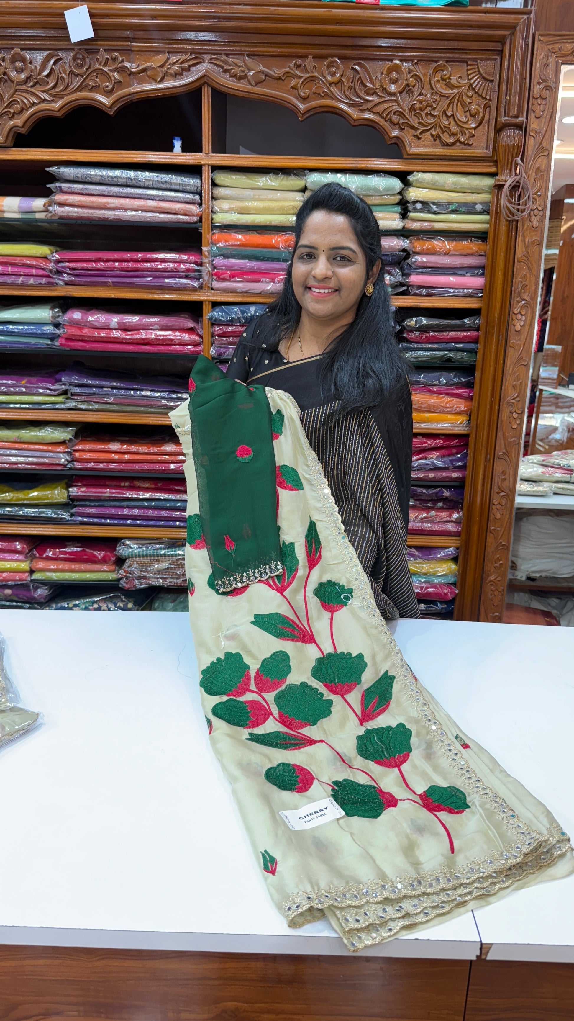 The WORK SAREE-SP999 is crafted from space silk, a lightweight and breathable fabric known for its durability and luxurious feel. This saree offers a sophisticated drape, ensuring comfort for extended wear. Its innovative material is resistant to wrinkles, enhancing the garment's longevity and ease of care.